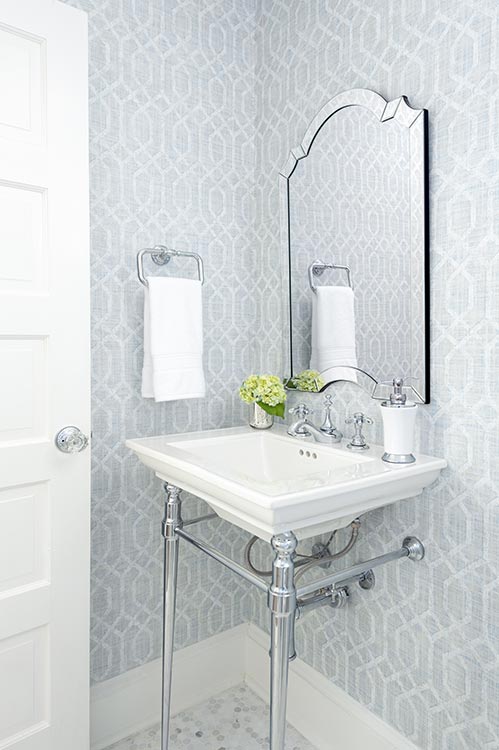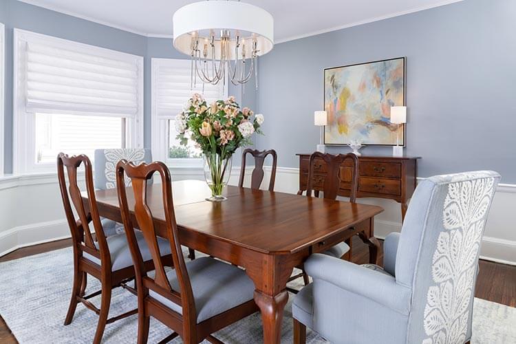 The house’s history takes center stage in the foyer with an original fireplace and beautiful stained glass windows. The butler’s pantry had been turned into a laundry room but still had the original cabinetry. We relocated the laundry, restored the cabinets, and made this space light and bright. The powder room became calm and glamorous in pale blue, nickel, and marble. A new chandelier and billowy roman shades made this dining room go from dark and heavy to light and airy. We used the clients’ dining set, with reupholstered chairs. An area rug, wispy art, a fresh new nickel chandelier and ceiling medallion finish out the space.