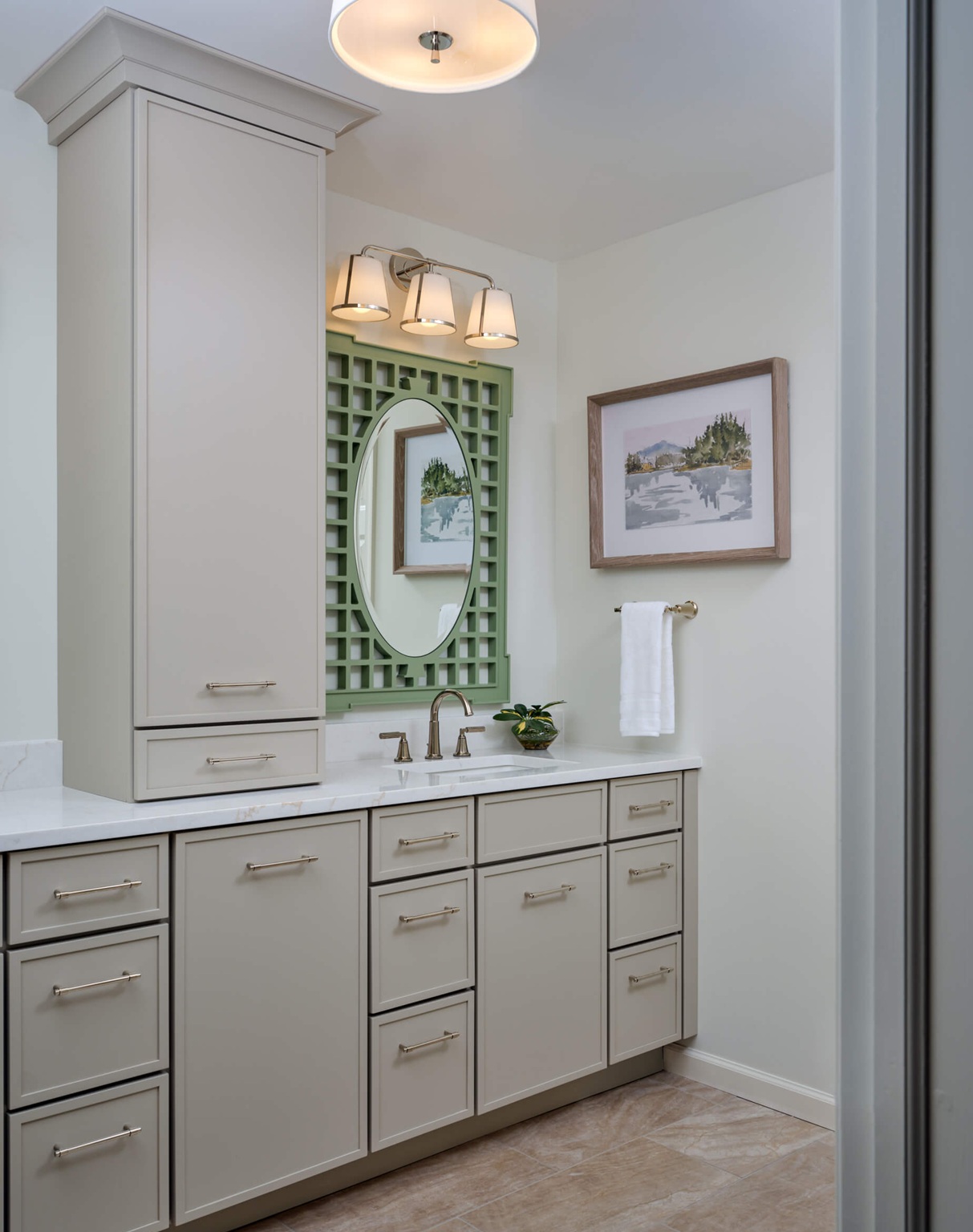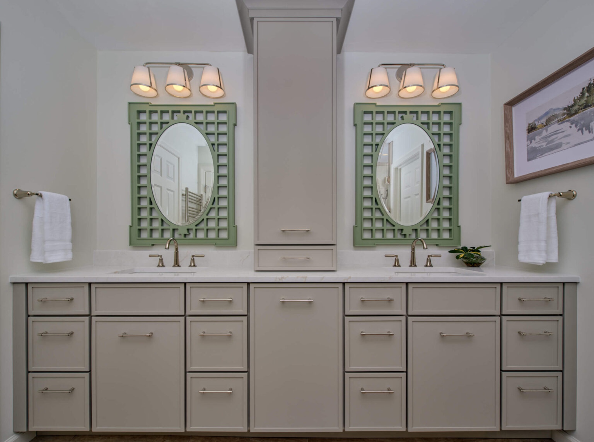 To introduce personality without compromising resale readiness, we incorporated striking chinoiserie green mirrors above the vanity. These mirrors make a memorable design statement yet can be swapped easily should the next homeowner prefer a different aesthetic.